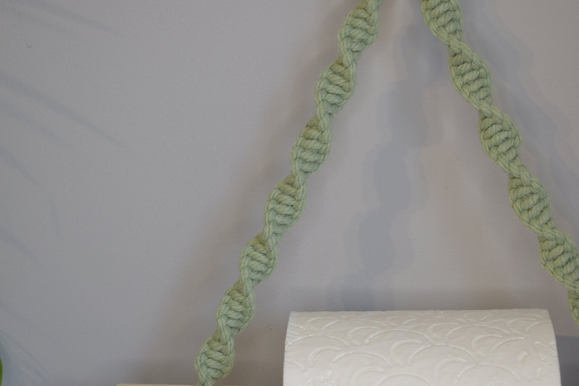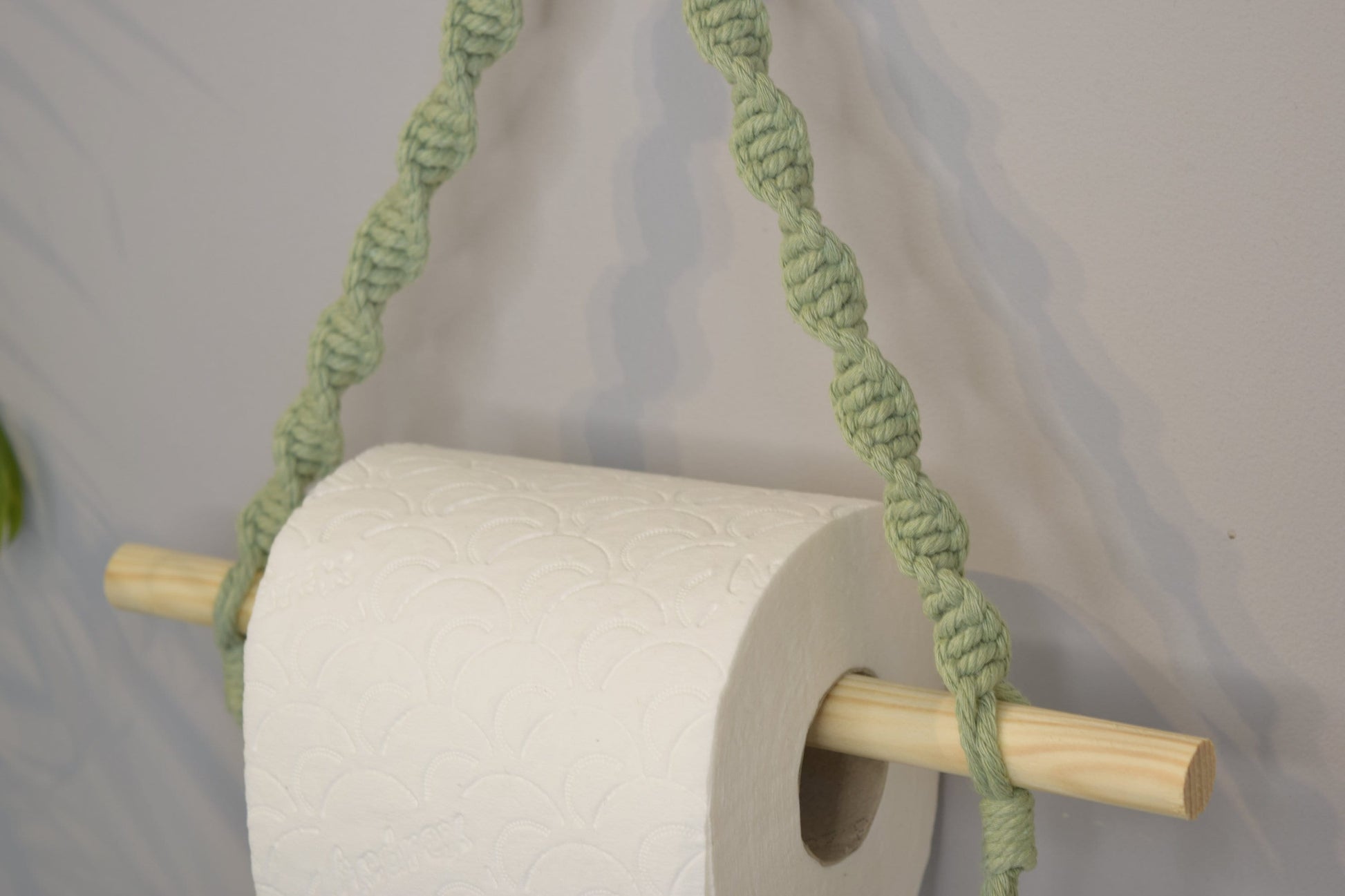 Handmade using 3mm cotton, on a wooden hanging ring with a 25 cm wooden dowel. Hanging length from top of ring to wooden dowel is approximately 30cm.Its simple design allows you to easily replace toilet rolls, just by sliding one side of the macrame cord off the stick and back on again when needed.